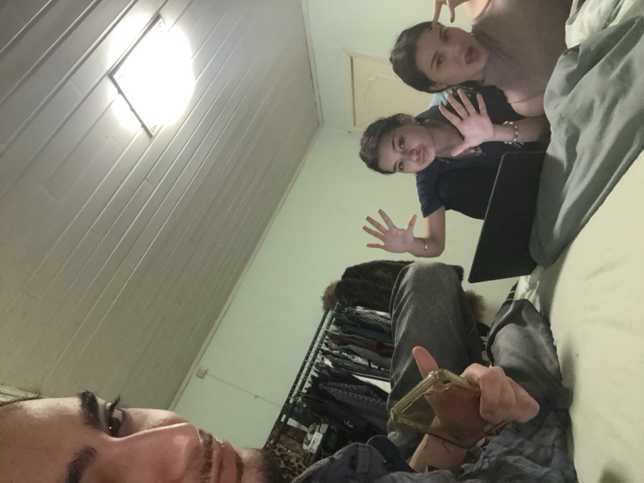 The scene depicts an interior room in Eeklo, Belgium. The room features light green walls and a white paneled ceiling with an illuminated, square-shaped ceiling light fixture. On the left side of the background, a clothes rack holds various garments, including a dark, furry jacket. A white door is visible on the right side of the background wall. Three individuals are present, positioned on a bed. In the left foreground, a male with dark hair, a mustache, and a short beard is visible from the nose down, wearing a dark long-sleeved top and gray trousers. He holds a smartphone with a clear, gold-edged case containing a brown object. In the mid-ground, a female with dark hair, wearing a dark blue t-shirt, is seated on the bed behind an open dark laptop. She looks towards the viewer with both hands raised, palms open and fingers spread. On the far right, a second female with dark hair, wearing a light brown top, is lying on the bed. She also looks towards the viewer with her mouth slightly open and her left hand positioned near her head, forming a finger gun gesture. The individuals are engaged in a casual, informal interaction.