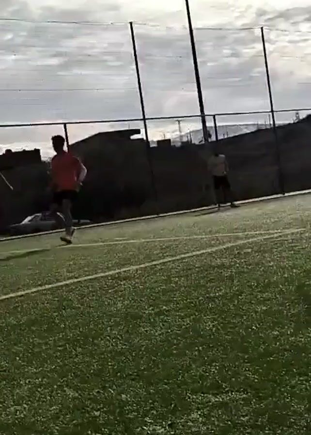 low-angle view of a soccer game on an artificial turf field. There are several people on the field, including some wearing orange jerseys and some wearing white or dark jerseys. One player is wearing a red jersey with the number 10 on the back. The players are moving around the field and kicking a soccer ball. A tall light pole is visible in the background, along with trees and a fence. The sky is cloudy. The video appears to be shot from the sidelines.