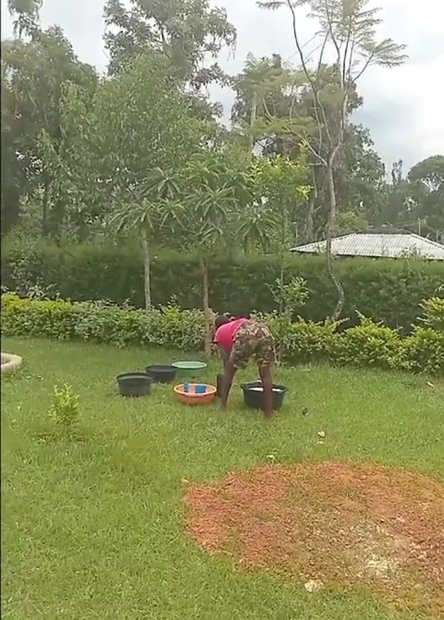 two people working in a grassy yard. One person in a pink shirt and camouflage shorts is repeatedly bending over and scrubbing something in plastic tubs. There are several of the tubs arranged on the grass. Nearby, a second person wearing a safety vest and hardhat is using tools to work on the base of a wooden pole that has been erected in the yard. There is a pile of dirt next to the pole. A white rope or cable is stretched out near the tubs. In the background, there are trees, a neatly trimmed hedge, and a building with a white roof.
