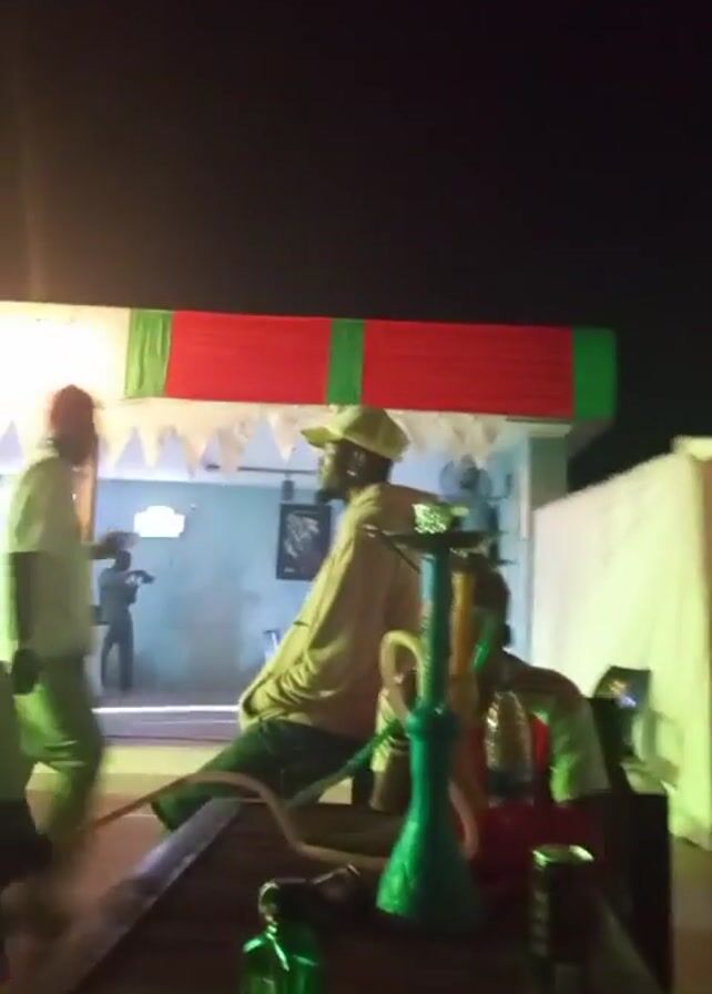 Here's a detailed description of the video: The video shows a dimly lit outdoor bar or lounge at night. Several men are present. One man is seated, wearing a tan jacket and a hat, seemingly relaxing and possibly smoking a hookah, which is on the table next to him. Another man, wearing a green shirt with writing, is standing and smoking. Other patrons are visible in the background. The bar area is decorated with red and green fabric, resembling a festive or holiday theme. A sign reading "CHELSEA BAR" is partially visible. There are tables with bottles and cans on them, suggesting people are drinking. The lighting is predominantly dark with some ambient light from the bar and surrounding areas. In the background, there's a blurry image of another man possibly taking a photo inside the bar. The overall atmosphere seems relaxed and casual.