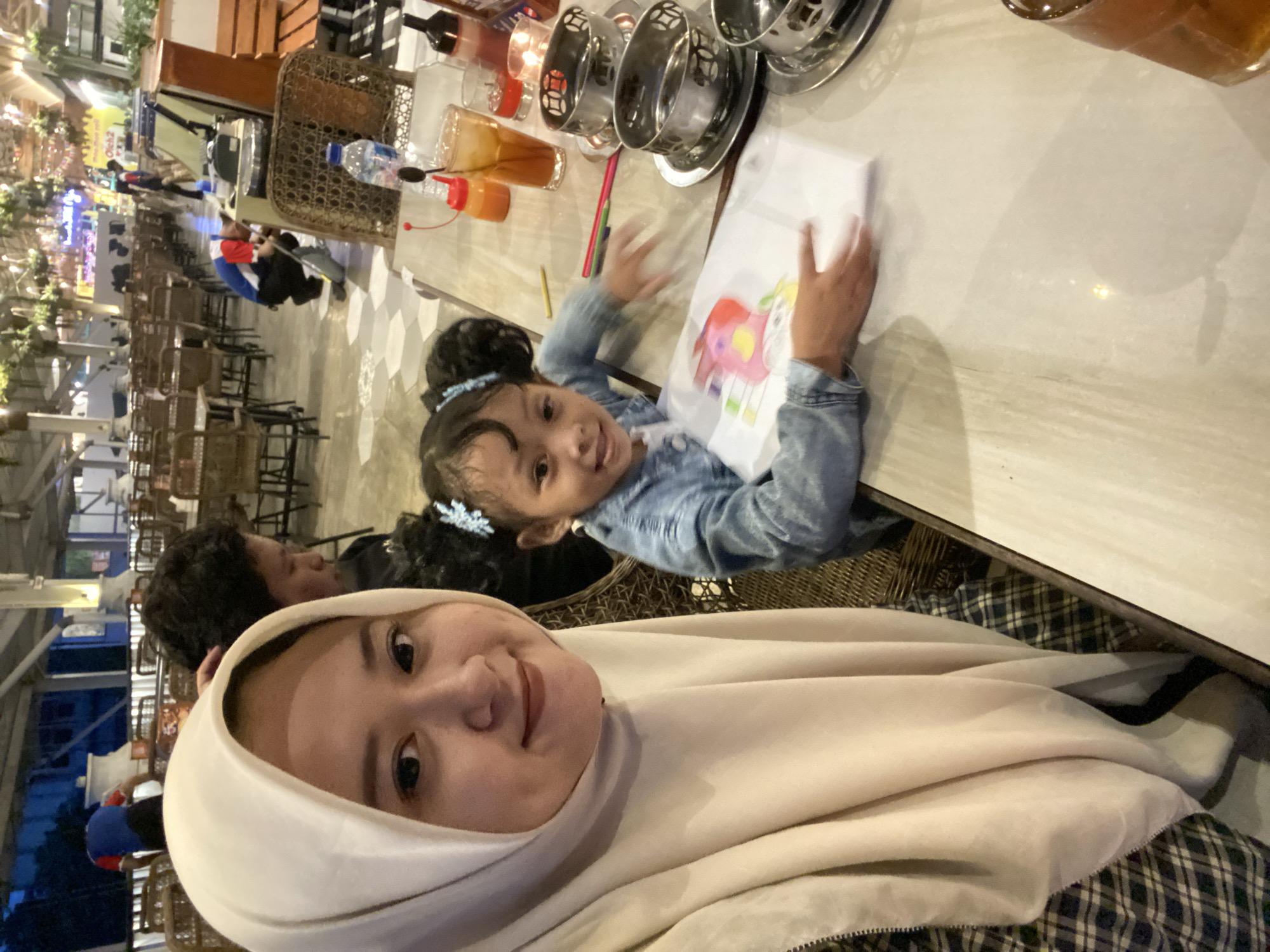 woman wearing a cream-colored hijab taking a selfie with a young girl. The girl, seated at a table, is coloring a picture with crayons or markers. A man is seated in the background. The table has beverages and cooking utensils and a partially drawn picture on top. Beyond the immediate dining area is an outdoor area with tables and chairs. The scene appears to be a restaurant in Prigen, Indonesia.