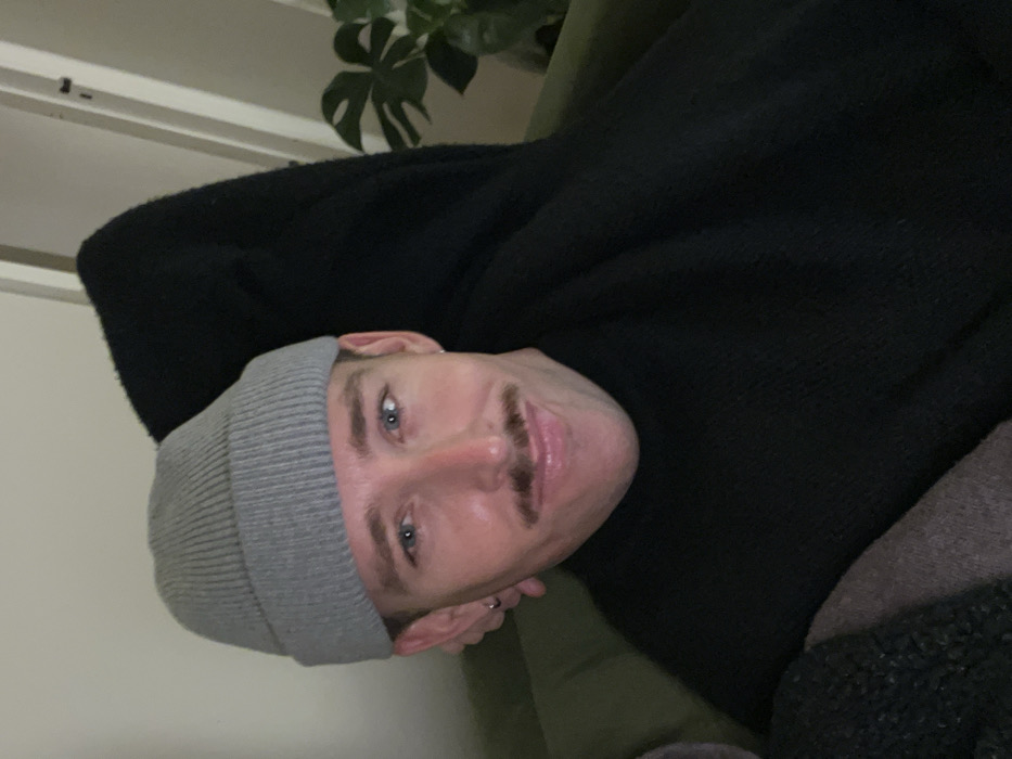 A man with blue eyes and a mustache wears a grey beanie and black sweater while reclining. A plant is visible in the background. The picture is taken at an angle, with the man's face tilted towards the left. He appears to be resting or relaxing.