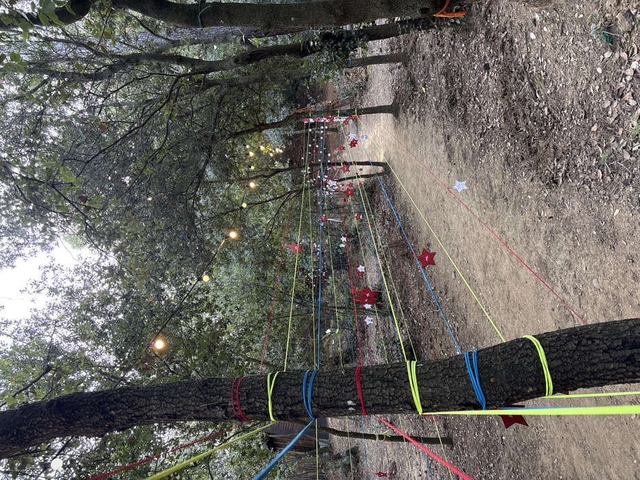 The image displays a decorated outdoor wooded area, likely a park or recreational trail, located in Castellar del Vallès, Spain