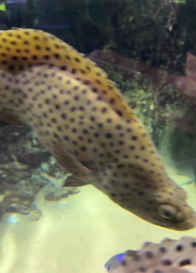two fish with brown spots in an aquarium with a sandy bottom and rocks at the back. Then a person's hand enters the tank, holding a fish that is mostly dark brown with some white and yellow. The hand holds the fish still for a moment.