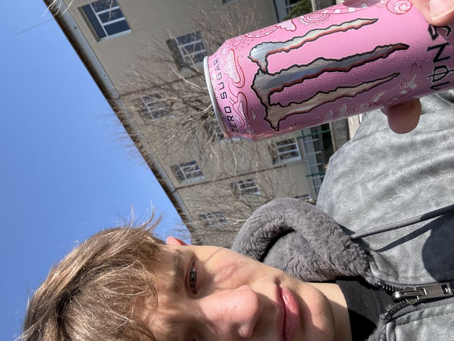 A selfie photograph captures a young male holding a pink Monster Energy "ZERO SUGAR" can in Simeonovgrad, Bulgaria
