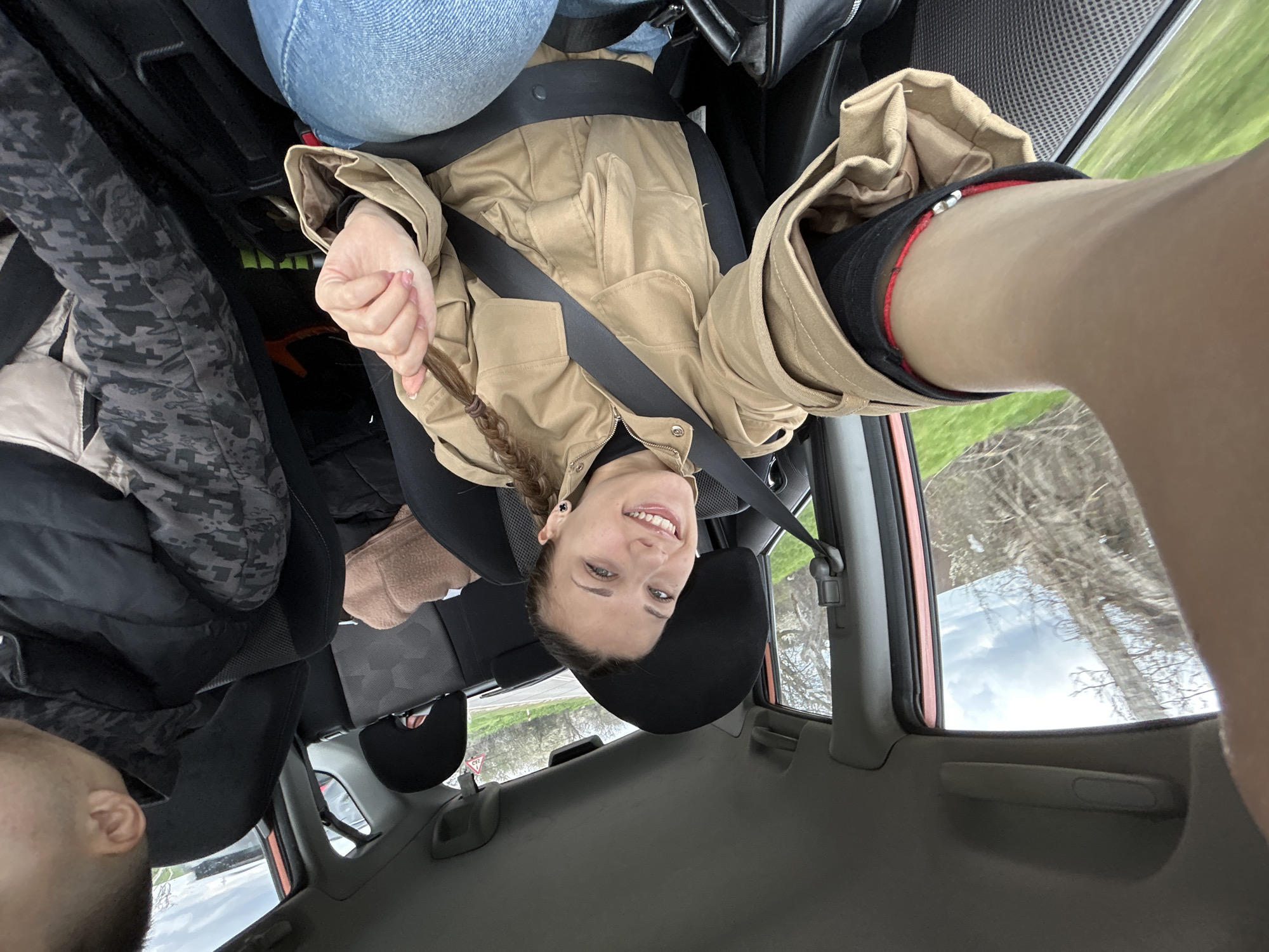 A woman is taking a selfie inside a car. She is wearing a tan jacket and a seatbelt. There is another person visible in the left side of the frame. The scene is upside down due to the camera's orientation. The background visible through the car window suggests an outdoor environment. The image was likely taken in Dve Mogili, Bulgaria, as requested.