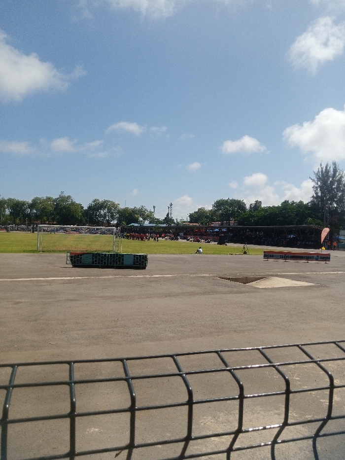 The image depicts an outdoor daytime scene within the Ganjoni/Shimanzi ward, Kenya. The foreground is occupied by a partially visible dark gray metal grid fence. Immediately behind the fence, a wide expanse of light gray asphalt or concrete pavement extends into the midground. On this paved surface, a stack of dark green rectangular objects is located on the left, and a white football goal frame with a net stands at the edge of a green grass field. Further right on the pavement, an orange and white barrier is present, along with a triangular depression. The background is dominated by the green grass field, where numerous individuals are visible. A cluster of people, many appearing to wear red attire, is gathered on the left side of the field near the goalpost. Larger groups of people are scattered across the right side of the grass field, some appearing seated in temporary bleachers or stands. A solitary individual in a white shirt is seated on the grass in the mid-right. Beyond the field, a dense line of green trees marks the horizon, interspersed with urban structures including buildings and communication masts. A tall, slender tree with sparse foliage stands on the far right. The sky overhead is bright blue with scattered white cumulus clouds, indicating clear weather.