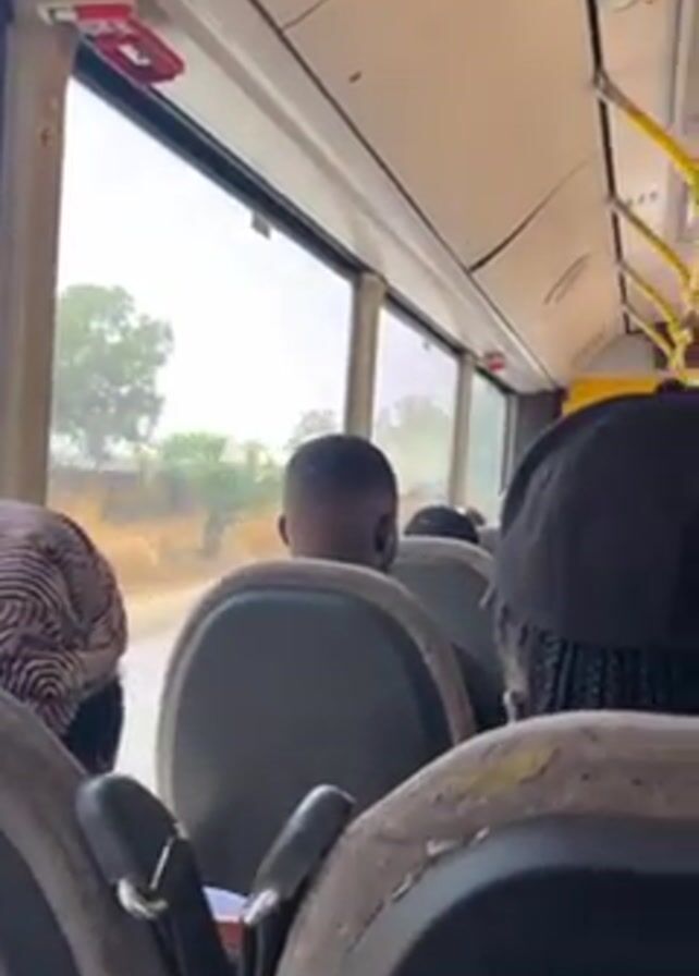 The camera is inside a bus looking towards the front
