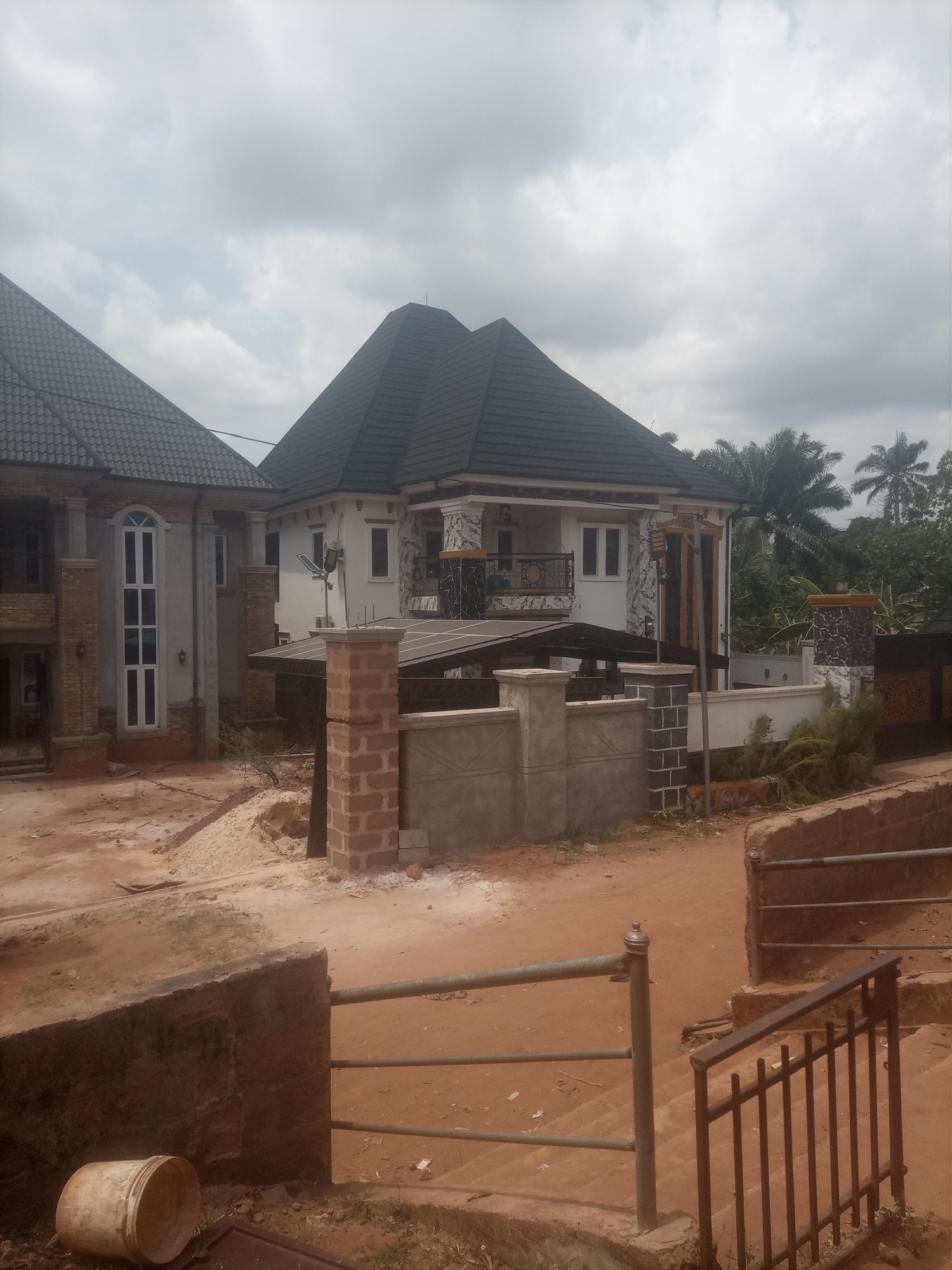 The scene depicts a residential area in Alor, Nigeria, under an overcast sky. Two multi-story houses dominate the background, positioned on either side of an unpaved, reddish-brown dirt road. The house on the left features a partially completed facade with exposed reddish-brown brickwork on the lower levels, contrasting with a section of plastered white wall containing a tall, arched multi-pane white window. It is topped with a dark grey tiled, hip-style roof. Construction materials, including sand piles, are visible directly in front of and to the left of this structure. The house on the right is a finished or nearly finished two-story residence with white plastered walls and decorative dark grey/black stone cladding accents. It has a distinctive dark grey tiled roof composed of multiple pyramidal sections. A balcony with ornate black metal railings extends from the second floor. A pole-mounted solar-powered street light is affixed to the exterior wall, and solar panels are installed on a low-slung, dark-roofed structure between the house and the property wall, possibly a carport. Property boundaries are defined by concrete walls with various finishes; some pillars are exposed brick, others have grey block cladding. An ornate black metal gate is partially visible on the far right. In the foreground, a set of reddish-brown concrete steps leads down to the dirt road, flanked by metal railings, one painted dark grey and another a lighter metallic grey. An overturned, off-white plastic bucket lies on the ground to the left of these steps. The immediate foreground shows uneven reddish-brown earth. Lush green tropical vegetation, including palm trees, is visible in the background behind the houses and between properties. No individuals are present in the scene, and no overt actions or interactions are depicted.