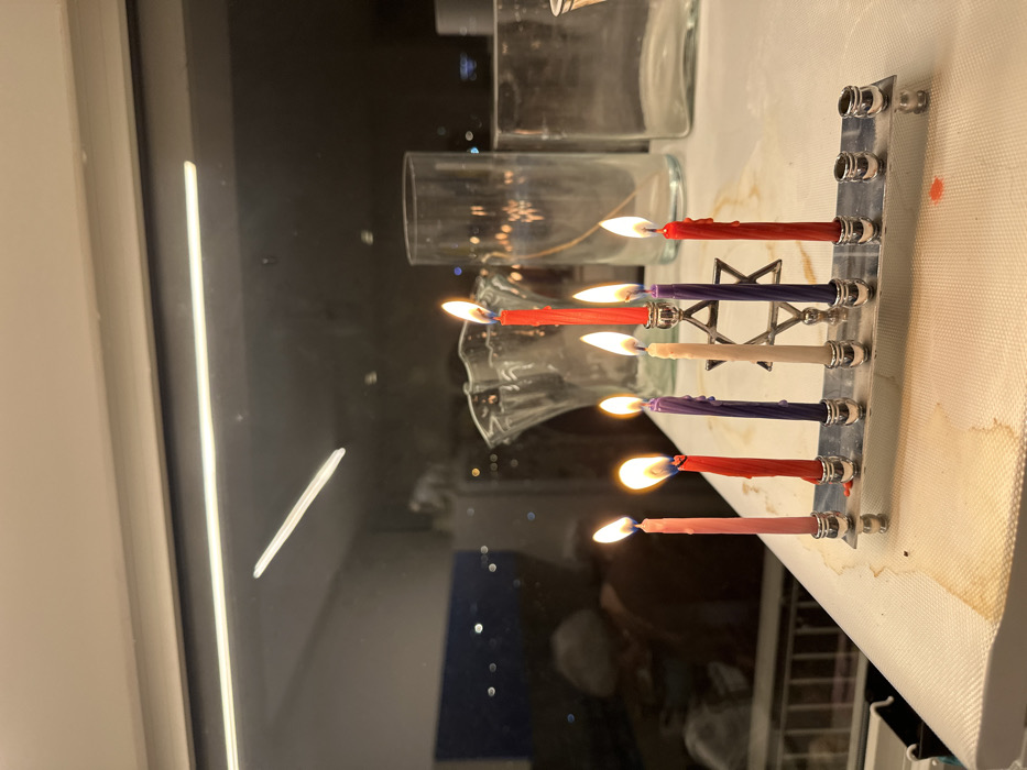 - "A menorah with five lit candles sits on a white surface near a window" by FM-RIphO2, licensed under CC BY 4.0