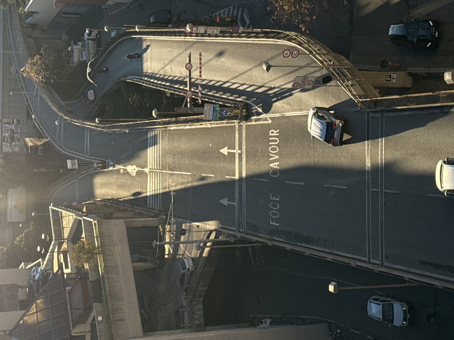 An elevated, aerial view focuses on a road intersection. The road is marked with "FOECE" and "CAVOUR" directional signage. A bridge runs above, casting a long shadow on the road. Several cars are visible, both on the main roads and along a winding side street. Traffic signs, a pedestrian overpass, and streetlights are also visible elements in the scene. The lighting indicates it's daytime.