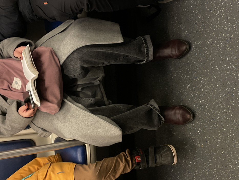 The interior of a Moscow Metro train car is depicted from a low-angle perspective, focusing on the lower bodies of three seated passengers. The environment includes blue cushioned seats, white horizontal grab rails, and a speckled grey floor. A central individual, wearing a light grey long coat, dark grey cuffed jeans, and dark red-brown pointed-toe ankle boots, holds an open book with white pages in their left hand. A black smartphone rests atop the book, which is situated on a pink corduroy tote bag in their lap. To the left, a partial view shows a child's lower body in a yellow jacket, brown trousers, and dark grey winter boots featuring a 'Reima' logo. To the right, a third passenger's leg is visible, clad in dark trousers with an orange tab on a side pocket. All individuals are seated in a row.