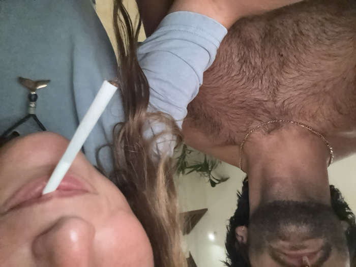 This image depicts two individuals in an indoor setting, reportedly in General Luna, Philippines. The scene is a close-up, focusing on the upper bodies and faces of the subjects. On the right, a female is partially visible from the chin downwards, with long light brown hair. She wears a light blue short-sleeved top and a black cord necklace featuring a metallic whale tail pendant. A white rolled cigarette or joint is held horizontally between her lips. Her left arm, clad in the light blue sleeve, extends across the lower center of the frame, resting against the chest of a male figure. The male, positioned on the left and visible from the upper chest to just below the nose, has dark hair, a beard, and dense dark hair covering his chest. He wears a thin gold chain necklace. A small, indistinct, white cylindrical object is positioned near his upper lip or nostril area. The background is dimly lit and out of focus, showing muted tones, a hint of green foliage on the right, and light-colored structural elements.