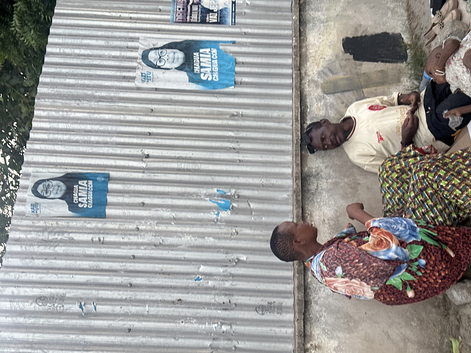 - "Three women sit on the concrete beside a corrugated metal wall adorned with campaign posters featuring a woman with glasses, identified as "CHAGUA SAMIA" in bold, blue letters" by FM-k3jgz2, licensed under CC BY 4.0