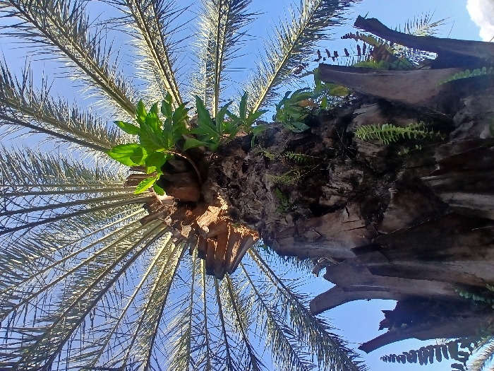 A low-angle shot showcases a palm tree against a clear blue sky. The trunk, rugged and textured, supports vibrant green vegetation sprouting from its surface. Ferns and other plants cling to the trunk, adding a touch of biodiversity. Palm fronds radiate outward, creating a fan-like pattern silhouetted against the sky. The composition emphasizes the height and upward growth of the palm.