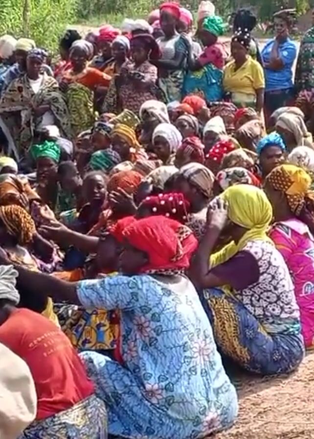 A wide shot reveals a large group of people gathered outdoors, primarily women, many of whom are sitting on the ground