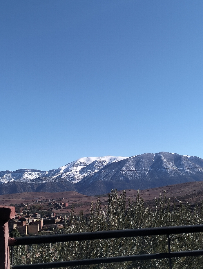 An outdoor scene in Ouaouizert, Morocco, captured from an elevated perspective, likely a balcony or terrace, under a clear blue sky. The foreground features a dark, horizontal metal railing spanning the lower width of the frame, positioned in front of dense, narrow-leaved green foliage, possibly olive trees. To the left, a reddish-brown architectural pillar or wall segment is partially visible. The midground presents a settlement composed of numerous square and rectangular buildings with reddish-brown walls and flat roofs, characteristic of traditional Moroccan architecture, clustered amidst dry, reddish-brown terrain. In the background, a prominent mountain range with multiple peaks is heavily dusted with white snow, contrasting with the dark brown and grey lower slopes. The sky above is uniformly clear and bright blue. No individuals or specific actions are discernible within the frame.