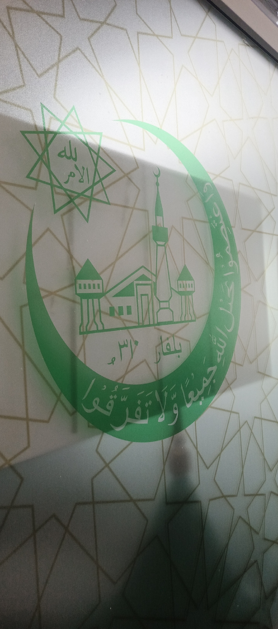 A close-up photograph depicts a green emblem affixed to a frosted or translucent panel, likely glass, in Bolshoye Savino, Russia. The emblem features a large green crescent moon framing a silhouette of a mosque, which includes a central building, a prominent minaret topped with a smaller crescent, and two smaller tower-like structures flanking the main building. Within the green crescent, Arabic calligraphy is visible along the inner curve, stating "And hold firmly to the rope of Allah all together and do not become divided" (Quran 3:103). Below the mosque silhouette, the Arabic word "بلقار" (Bulgar) is present, followed by "٣١٠ م". In the upper left quadrant, a green eight-pointed star design contains further Arabic text, "لله الأمر" (To Allah belongs the command). The background of the panel exhibits a faint, lighter-colored geometric pattern of interlocking stars and polygons. Reflections are apparent on the lower half of the panel, obscuring some background details. No individuals or specific actions are discernible. The upper right corner reveals a subtle edge, possibly a door or window frame.