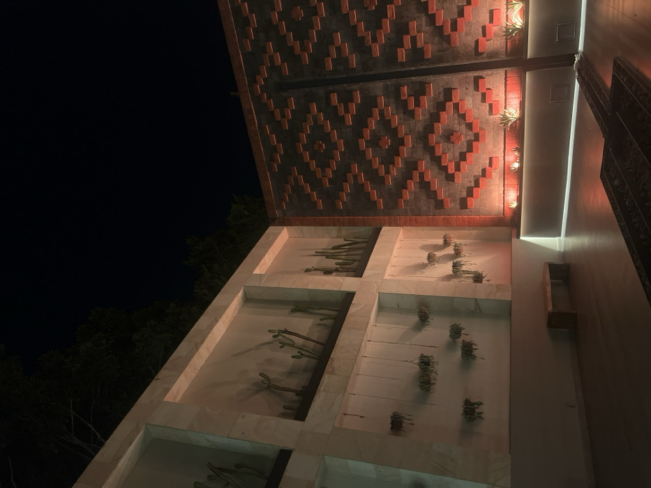 An exterior shot captures a building at night. The structure features a patterned brick or tile roof extending over a facade with embedded, rectangular planters. Some planters contain cacti or similar desert plants. Artificial lighting illuminates the building, creating a contrast with the dark sky and silhouetted trees in the background. The angle emphasizes the building's height and architectural design.