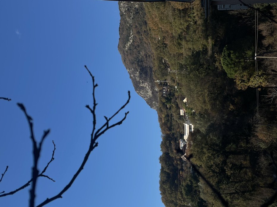 The image depicts a mountainous landscape under a clear blue sky, consistent with the terrain surrounding Budva, Montenegro. In the foreground, out-of-focus dark tree branches extend from the top, framing the upper portion of the scene. The midground features a steep hillside densely covered with deciduous and evergreen trees, exhibiting autumnal coloration in parts. Several white or light-colored multi-story residential buildings are visible interspersed among the trees on the slope. Multiple horizontal power lines traverse the midground, supported by a prominent, dark-colored lattice utility tower located to the right of center. The background reveals a rugged, rocky mountain peak with areas of sparse vegetation, rising against the clear sky. No individuals or discernible actions are present in the scene. The lighting indicates a bright, sunny day, casting some shadows within the dense vegetation.