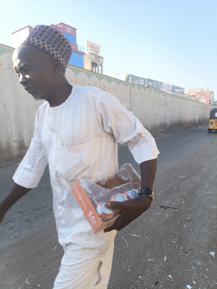 An African man in a patterned hat and white traditional clothing walks on a paved road. He carries a cardboard box filled with canned drinks. Behind him is a concrete wall decorated with floral designs. Further back, buildings and advertisements are visible. A yellow tricycle is parked on the right side of the road. The sky is clear and bright. The scene suggests a casual, everyday moment in an urban setting.