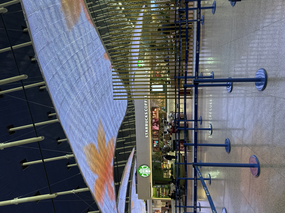 This image captures a wide-angle view of a modern indoor commercial space, identified as Pudong International Airport in Pudong, China, based on the architectural style and common airport amenities. The scene is dominated by a Starbucks Coffee establishment situated centrally. The environment features a high, dark blue ceiling from which numerous light-colored cylindrical supports descend. Below these supports, a large, wavy, translucent fabric screen is suspended, functioning as a digital display projecting diffuse orange, leaf-like patterns onto its surface. The floor is light-colored, polished, and reflective, showing subtle reflections of the overhead lighting and the "STARBUCKS COFFEE" sign. In the foreground, a structured queueing area is delineated by multiple blue stanchions connected by blue retractable belts. These barriers occupy the majority of the lower half of the frame, guiding potential foot traffic. The central subject is a brightly lit Starbucks Coffee counter, marked by its prominent green circular logo and the "STARBUCKS COFFEE" text illuminated above. Behind the counter, various menu boards display beverage and food options. Several staff members are visible behind the counter, engaged in service. Around the Starbucks, a decorative screen of vertical, gold-colored, bamboo-like elements creates an enclosure or visual break. Within the Starbucks area and immediately adjacent to it, several individuals are present. A few people are seated at tables, appearing to be customers, while others are standing near the counter, suggesting they are ordering or waiting for service. The specific actions and interactions of individuals are largely generalized due to the distance. Display cases inside the Starbucks show various food items. The overall lighting is bright and even, highlighting the commercial nature of the space.