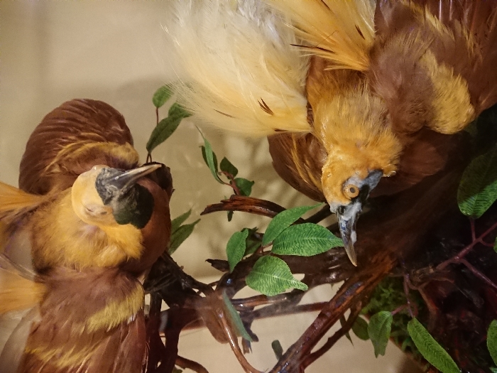 This image depicts a close-up of two taxidermied birds, likely Greater Birds-of-Paradise, arranged within a display