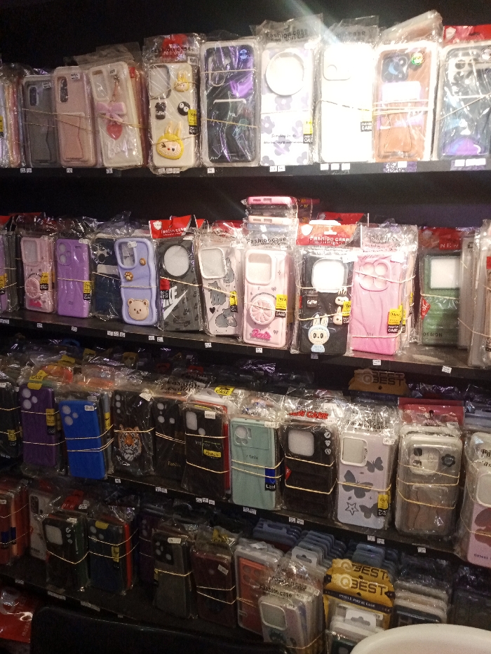 - "The image displays a retail store's product display section featuring numerous smartphone cases on dark, multi-tiered shelves" by FM-MMPOs1, licensed under CC BY 4.0