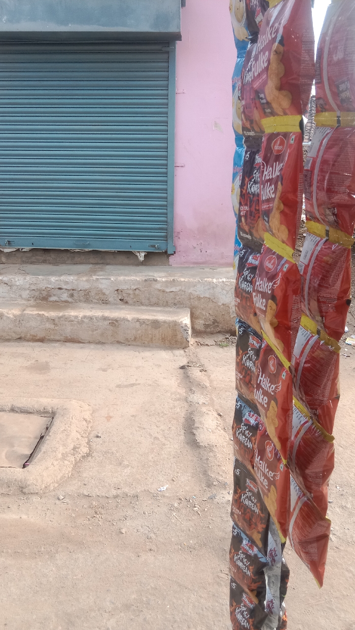 row of bags of "Spicy Korean Halke Fulke" potato chips hanging from a pole in front of a closed shop with a blue metal roll-up door. The shop is located in Gandhigram, India, at coordinates 23.357 latitude and 80.021 longitude. The bags are arranged vertically, with the top of the pole obscured by the bags. The bags are all red and have a white design featuring a depiction of the chips. The background is a dusty, brown ground, with a concrete step leading up to the shop door.
