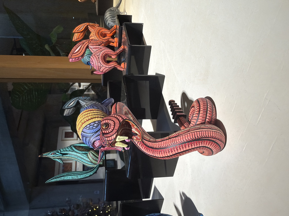 A collection of colorful, hand-painted wooden animal sculptures are displayed on a black, stair-step shelf. The sculptures include rabbits with intricate designs in shades of orange, red, blue, and green. One sculpture depicts a snake-like creature in red tones, coiled and resting on one of the shelf tiers, its shadow cast on the wall. Some sculptures are partially obscured, and there are green plants and reflections in the background. The composition is artistic and visually striking.