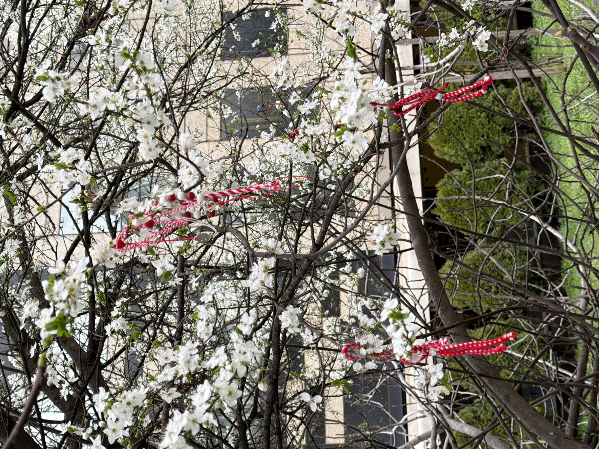 A blossoming tree stands in front of a building in Varna, Bulgaria. Red and white "Martenitsa" ornaments are tied to the tree branches, symbolizing good health and prosperity. The building has multiple windows and a light-colored facade. To the right, another tree with green foliage is visible. The image is rotated slightly counter-clockwise.