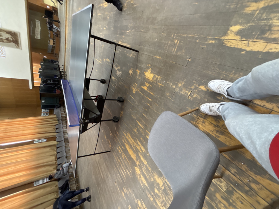 This image captures an indoor hall in Sopot, Bulgaria, observed from a low, seated first-person perspective. The viewer's legs, dressed in light grey sweatpants and white athletic shoes, are extended into the foreground, with a grey upholstered chair partially visible to the immediate left. The floor is composed of distressed wooden planks, exhibiting significant wear and patches of faded yellow paint. Centrally located in the midground is a dark-surfaced, foldable table tennis (ping-pong) table, equipped with a blue net and black metal legs on caster wheels. To the left of the table, in the midground-background, a person wearing dark attire is captured bending forward at the waist. Further along the left wall, a row of identical grey chairs is visible, with one person seated on a chair, facing right. The background features a large white panel or screen on the right wall, displaying a sepia-toned portrait of a man above the year "1888." Below this screen, multiple dark, folded partitions or tables are stacked. Several indistinct human figures are also visible in the far background. The upper left portion of the hall is draped with warm-toned curtains.
