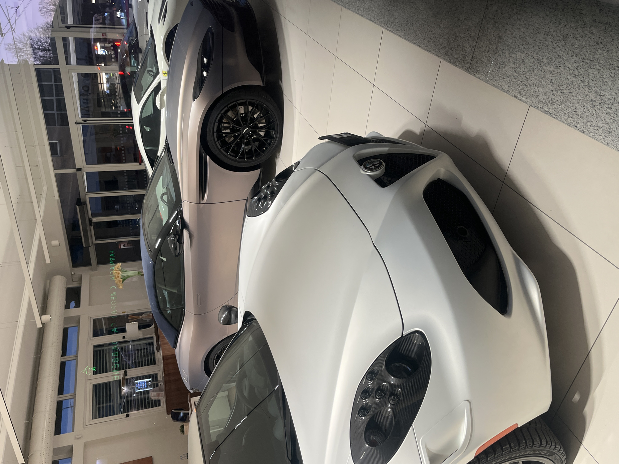 The image displays the interior of a luxury automobile showroom located on Corso Moncalieri in Turin, Italy, adjacent to "Farmacia C. Negretti" as indicated by a reversed reflection on the glass. The scene features three high-performance vehicles on a white tiled floor under bright overhead lighting. In the immediate foreground, a matte white Alfa Romeo 4C is positioned, with its front fascia, including carbon fiber headlight bezels and the central Alfa Romeo grille badge, prominent. Behind it, and slightly to the right, is a rose gold or bronze Aston Martin DB11 Volante convertible with a dark blue soft top and black multi-spoke wheels. Further in the background, a white Ferrari, identifiable by a yellow shield badge on its fender, is partially visible through reflections in the large plate-glass windows of the showroom. The showroom's interior is characterized by white walls and a ceiling with exposed HVAC ductwork. Reflections in the windows reveal portions of the street outside, including bare trees, other buildings, and distant artificial lights, suggesting late afternoon or early evening. Interior reflections also show a wooden counter with a vase of yellow flowers, a table lamp, and a digital display or tablet on a stand. No individuals are present in the visible frame.