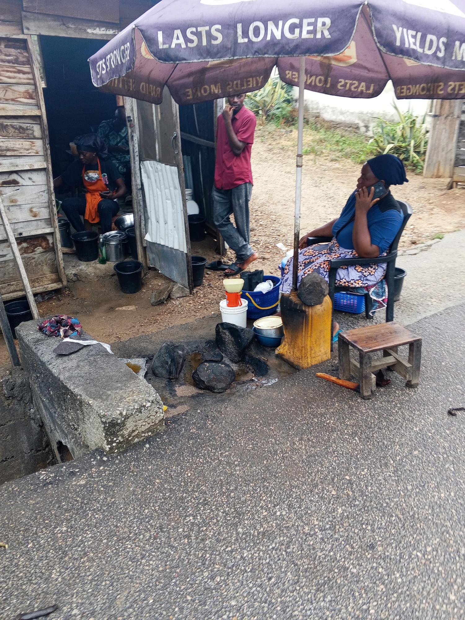 The image depicts a scene in Lokoja, Nigeria. A woman is seated in a black plastic chair under a branded umbrella, engaged in a phone call. She is wearing a blue top and a patterned skirt. A man in a red shirt and jeans stands behind her under the umbrella, seemingly also on a phone. Next to her is a makeshift cooking setup consisting of a yellow plastic container used as a stand with a cooking pot on top, surrounded by black rocks. A small wooden stool is situated nearby. Adjacent to this area is a wooden shack with a tin sheet extension. Inside the shack, at least two individuals are visible, one with an orange apron. Buckets and kitchenware are scattered around the shack. The setting appears to be an outdoor cooking or food vending area, positioned next to a street.