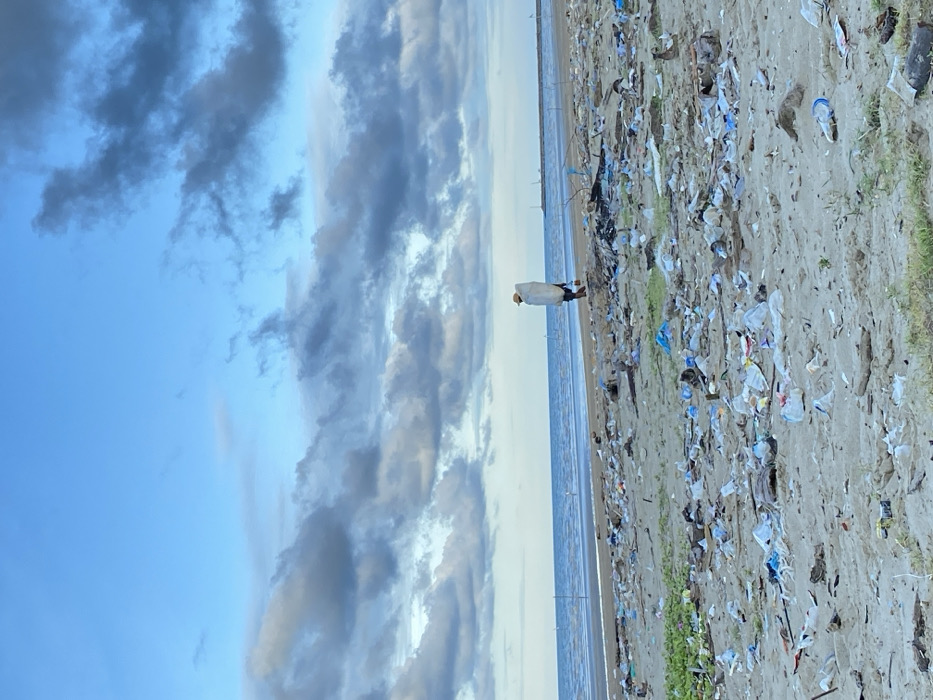 This image depicts a sandy beach in Kualaidi, Indonesia, under a sky with both clear blue areas and scattered dark cumulus clouds. The horizon line is visible, separating the sky from the calm, light blue ocean. Two thin vertical poles are present in the shallow water near the left side of the frame. In the far distance on the right, a structure resembling a pier or breakwater extends into the water. The sandy foreground of the beach is heavily strewn with an extensive accumulation of various debris, primarily plastic waste. This waste includes numerous white, blue, and transparent plastic bottles, plastic bags, and fragmented plastic items. Interspersed with the plastic debris are pieces of driftwood and sparse patches of green vegetation. One individual is visible walking on the beach, approximately mid-ground, heading towards the right side of the frame, parallel to the waterline. The person is dressed in dark clothing, wears a light-colored hat, and carries a large, elongated white sack or bag over their left shoulder. The individual is walking on the sand, traversing the littered environment.