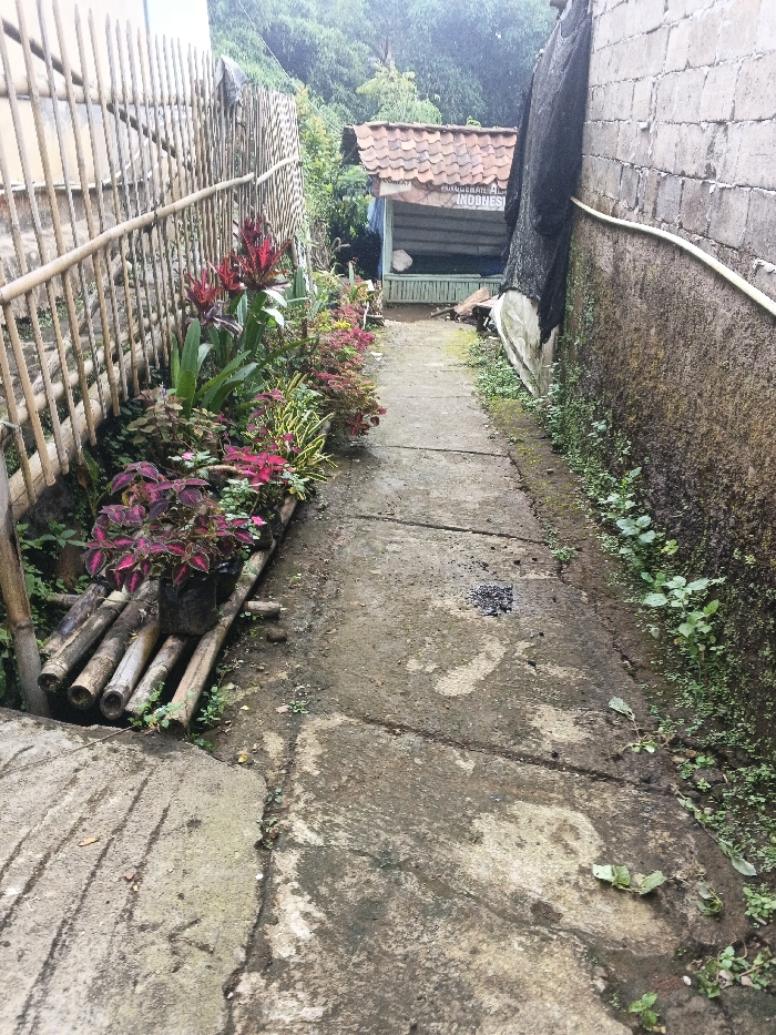 A narrow, damp walkway leads to a covered structure in the distance
