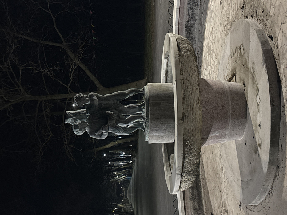 - "The image displays a multi-tiered stone fountain with a three-figure sculpture, situated in a park or public space in Yambol, Bulgaria, during nighttime hours" by FM-dhA7o2, licensed under CC BY 4.0