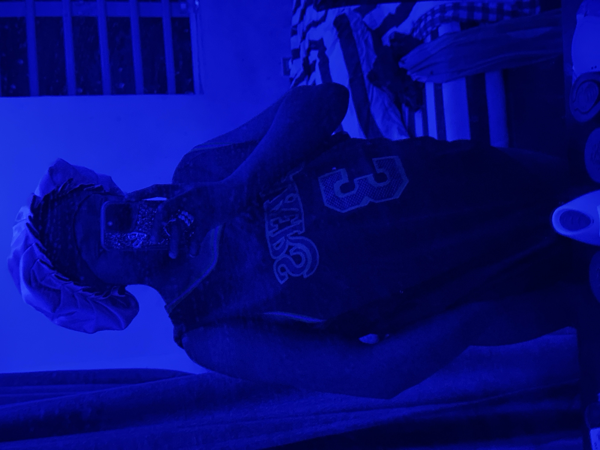 A person wearing a bonnet and sports jersey with the number "3" is taking a selfie with a phone. The scene is heavily bathed in blue light, obscuring details. In the background, there is a barred window and what appears to be a bed or striped furniture. Without more information, it is not possible to accurately determine a specific location in Abuja, Nigeria.
