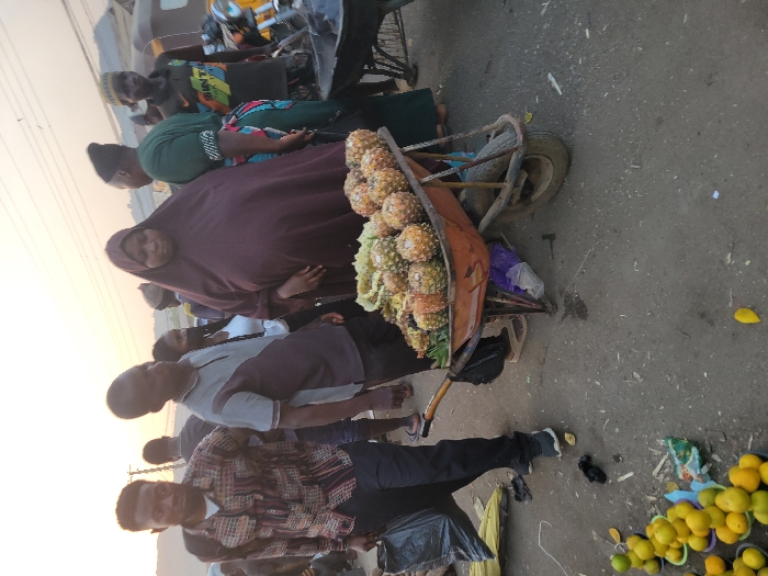 A woman in a maroon hijab stands beside a wheelbarrow overflowing with pineapples. She's surrounded by people in a bustling outdoor market setting. Several men are visible nearby, along with a motorcycle rickshaw parked close to the woman. To the right are a scattering of yellow fruits, possibly oranges or mangoes, spilled on the ground next to some trash. The scene captures everyday life in a vibrant, informal market.