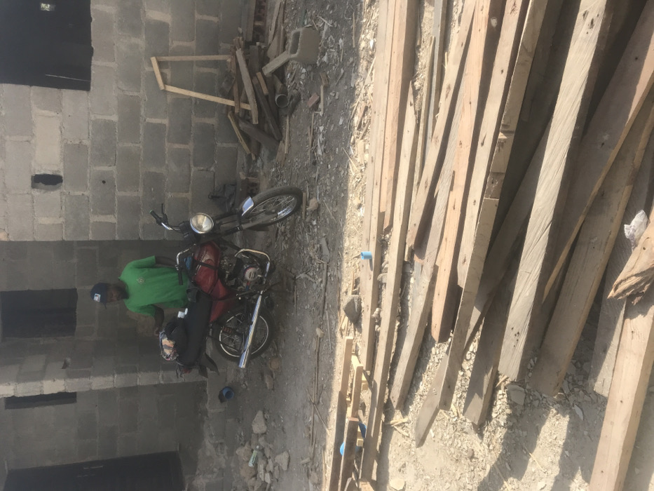 The scene depicts an outdoor construction site in Gwong, Nigeria. In the midground, a single adult male stands to the right of a dark red motorcycle with chrome accents, positioned on a dirt and gravel surface. The man wears a green short-sleeved shirt, dark trousers or shorts, and a dark baseball cap; his right hand is near the motorcycle's rear seat. The background features a partially constructed building made of grey concrete blocks, with multiple unglazed window openings and door frames. A dark door is visible on the far left of the structure. The foreground and midground are covered with numerous wooden planks of various lengths and widths, scattered across the uneven ground. Additional construction debris, including small concrete fragments, a blue pipe segment, and a pile of assorted lumber and concrete blocks, is present on the ground. The scene is brightly lit by natural daylight.