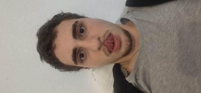 A young man with dark hair and brown eyes is sticking out his tongue at the camera. He is wearing a gray t-shirt and has a short beard. The background is a plain white wall. His face is centered and takes up most of the frame. The image appears to be a selfie taken indoors.