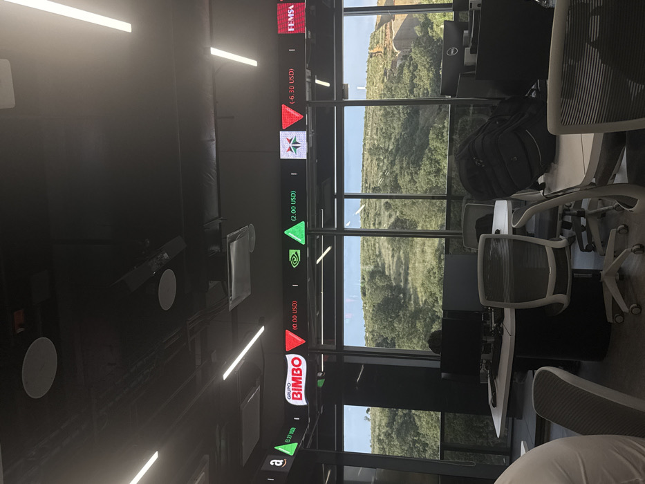 This image depicts a modern office interior situated in Interlomas, Mexico. The space features a dark ceiling with exposed conduits, multiple linear light fixtures, and circular recessed lights. Above a series of large windows, a horizontal LED stock ticker displays company data, including Amazon (showing a green upward triangle and +3.27 USD), Grupo Bimbo (red downward triangle and 0.00 USD), Nvidia (green upward triangle and +2.00 USD), an unidentified entity (red downward triangle and -6.30 USD), and FEMSA. Through the windows, a bright, clear blue sky is visible above a natural, undeveloped hilly landscape densely covered with green vegetation, primarily trees and shrubs. A lighter, possibly rockier or eroded section of a hill appears on the far right. The office interior contains multiple modern office chairs with mesh backs and five-star wheeled bases, predominantly in shades of gray and white. A multi-sided desk unit, possibly hexagonal, is positioned in the mid-ground, equipped with several computer monitors. A black backpack rests on one of these desks. The back of one individual's head and shoulders are partially visible behind a desk, oriented towards the windows. The shoulder and arm of another person, wearing a white shirt, are visible in the extreme left foreground. No specific actions or interactions are discernible beyond the individuals' presence in the office setting.
