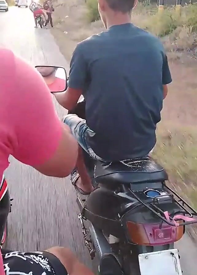 two men riding on a scooter down a paved road. The man in front is wearing a dark blue shirt and jean shorts. The man behind is wearing a pink shirt and black and white patterned shorts. Both are wearing sandals. A white van and a few other people on scooters are visible in the distance. The road is bordered by greenery. The video appears to be taken during the day.