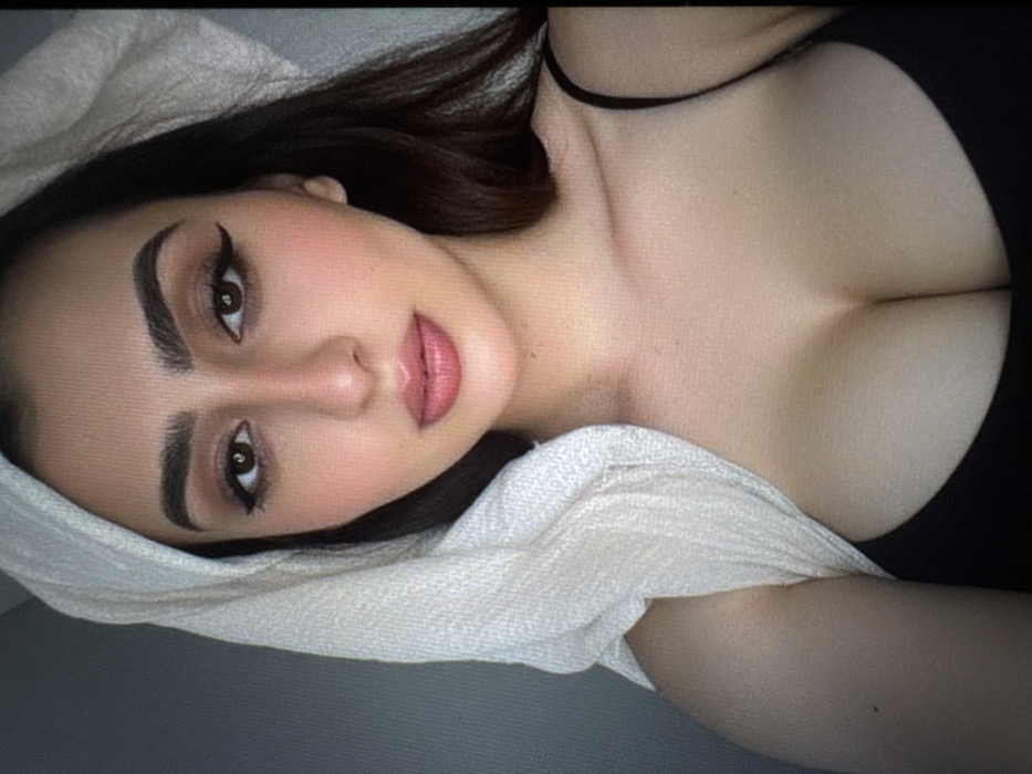 A woman lies with her head resting on a white woven cloth. Her dark hair frames a face with strong brows, lined eyes, and full lips. She wears a dark top with thin straps, revealing part of her chest. The image is taken from above, accentuating her features and the curves of her body.