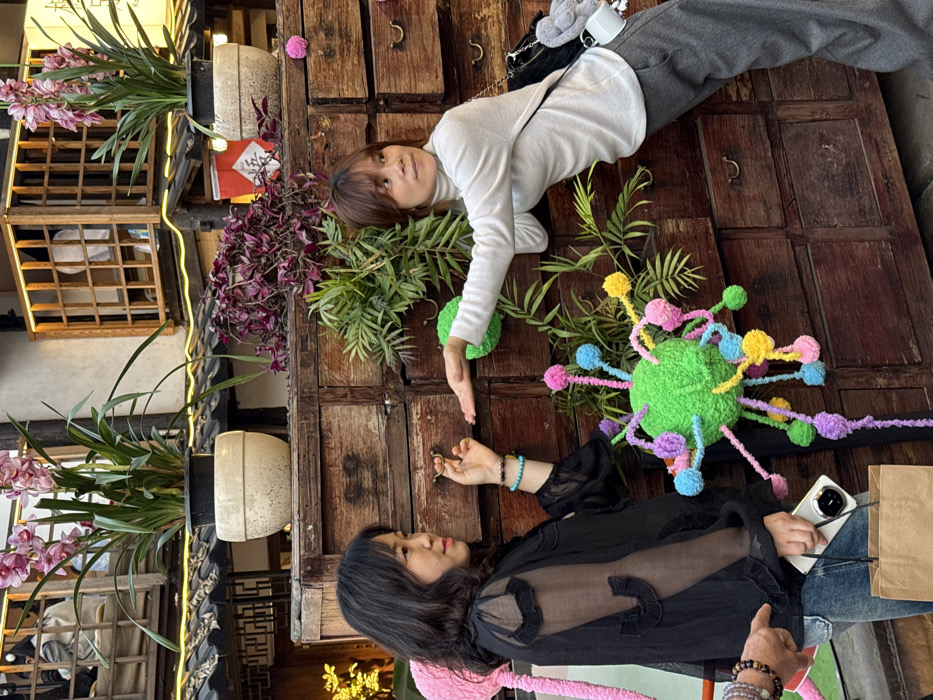 Two East Asian females are positioned in an outdoor setting in Nan'an District, China, in front of a tall, dark-stained wooden cabinet with numerous small drawers featuring metal ring pulls. The background reveals traditional Chinese-style buildings with dark tiled roofs, yellow string lights, and lattice windows, along with potted plants including pink orchids. The woman on the left has dark, shoulder-length hair and wears a sheer black blouse with textured details and blue jeans. Her left hand holds a brown paper bag and a white smartphone, while her right hand is near a cabinet drawer pull, adorned with a blue and brown beaded bracelet. She gazes towards the right and slightly upwards. Partially visible to her left is a pink, flamingo-like decorative object. The woman on the right has light brown, short hair with bangs and wears a light grey turtleneck sweater and dark grey pants. She leans against the cabinet, extending her right arm outwards to the left with her palm open and facing upwards. She looks towards the right. A black shoulder bag with a grey knotted keychain and a white earbud case hangs from her left shoulder. Between the two women and in front of the cabinet is a large, bright green, textured spherical object from which numerous colorful, smaller pom-pom spheres on stalks protrude, in shades of pink, yellow, blue, purple, and green. A smaller green textured sphere is affixed to the cabinet near the right woman's outstretched hand, and a single pink pom-pom is visible on a drawer further right. Various green leafy plants, including one with dark purple leaves, are arranged on and around the cabinet. A red sign with white Chinese characters is visible on a building in the upper right background.