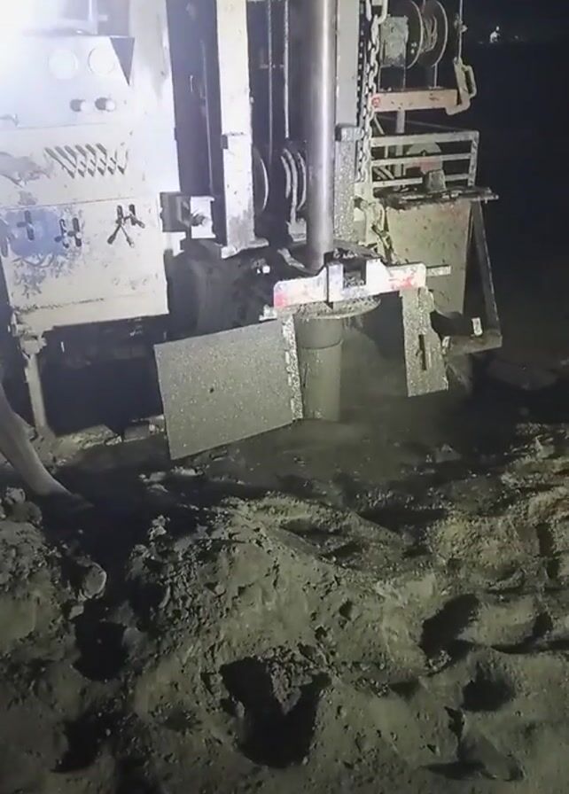 At night, a drilling rig is operating in a muddy environment. The rig itself is large and industrial, with a vertical tower and a complex system of pulleys and cables. It is predominantly white and appears worn and dirty. Mud and water are splashing around the base of the rig. An individual is standing near the rig. The scene is illuminated by a bright light, likely attached to the rig, which washes out some details. The surrounding area is dark and muddy, with visible footprints in the ground. The rig is actively drilling, evident from the movement of the machinery and the splashing mud.