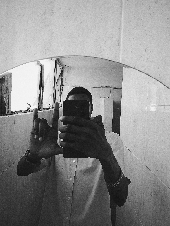- "This black and white mirror selfie depicts an individual from the chest up, positioned in an interior tiled room in Shaba, Nigeria" by FM-XVkOE3, licensed under CC BY 4.0