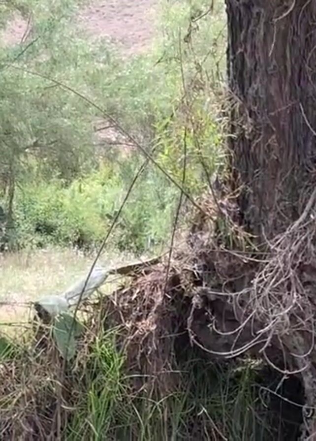 The camera pans from a ground-level view of tangled greenery to a wider shot of a gate situated between two large, gnarled trees. The gate appears to be made of metal bars with a solid metal sheet at the bottom. A sign, though not fully legible, is visible on the gate. Overgrown vegetation covers parts of the gate and surrounding area. Patches of grass and a dirt path lead up to the gate. A utility pole and some pipes are visible in the background to the right of the gate.