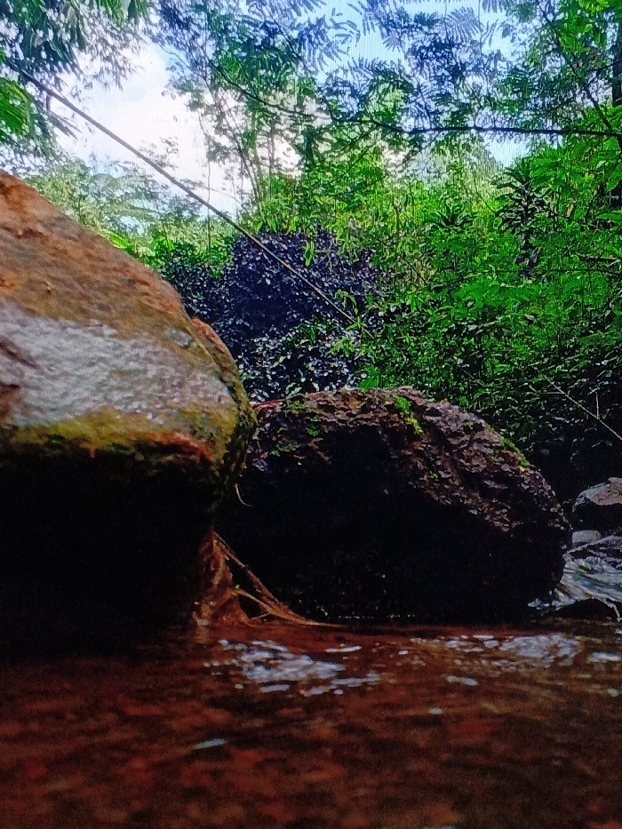 The image depicts a natural stream winding through dense vegetation, stated to be located in Taungpi, Myanmar (Burma). In the immediate foreground, a shallow body of reddish-brown water, likely a stream, exhibits ripples indicating movement. Two prominent, dark-colored rocks, partially submerged and covered with moss and algae, occupy the left and central foreground. The rock on the far left shows a lighter, possibly eroded or mineral-stained area. Roots are visible extending from the bank into the water near the left rock. The midground continues with the stream and additional rocks on the right. The background is dominated by a lush, vibrant green forest canopy, with a section of darker, purplish-green foliage visible centrally. Above the foliage, glimpses of a bright, overcast or partially cloudy sky are visible. A thin, dark linear object, possibly a wire or distant branch, extends diagonally across the upper left portion of the frame. No human subjects or animals are present. The scene is illuminated by natural daylight.