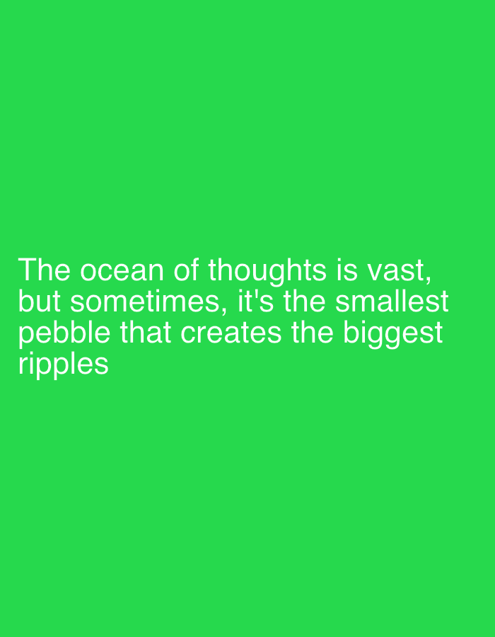 The image displays white text positioned in the lower-left quadrant against a solid, uniform green background. The text reads: "The ocean of thoughts is vast, but sometimes, it's the smallest pebble that creates the biggest ripples". This image does not depict a physical location in the city of Yakutsk, Russia, or anywhere else, as it consists solely of text overlaid on a monochromatic digital background. There are no individuals, tangible subjects, physical objects, actions, or interactions present in the scene.